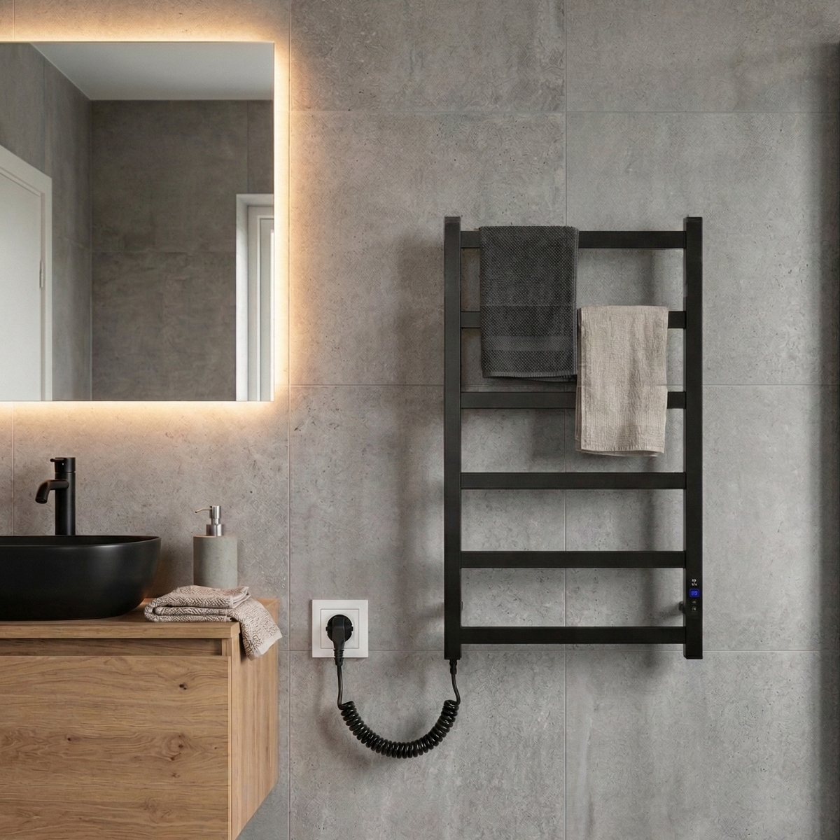 Для зручності користувача передбачене подвійне підключення живлення (з лівого або правого боку), а також комплект прихованого монтажу, що дозволяє гармонійно інтегрувати сушарку у будь-який інтер’єр.