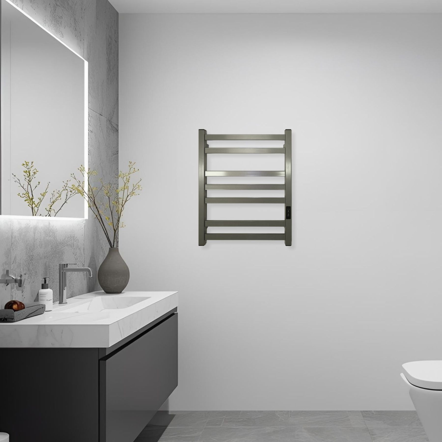 Має подвійний вивід живлення, який дозволяє підключати сушарку з будь-якого боку, та комплект прихованого підключення для естетичного монтажу. Конструкція складається з 7 профільних ребер 30×10 мм та квадратних стійок 30 мм, утворюючи стильну італійську геометрію.